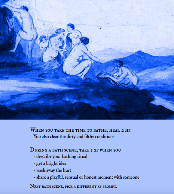 Don't you want to tenderly wash off the blood of your companion's back after she saved your life, moving on instinct, no care for her own life, you didn't know you mattered to her like that and you don't know what to say so you wring the blood from the rag and don't think about how you're both naked in the water?