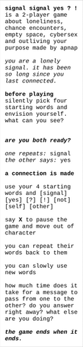 signal signal yes ? ! is a 2-player game about loneliness, chance encounters, empty space, cybersex and outliving your purpose